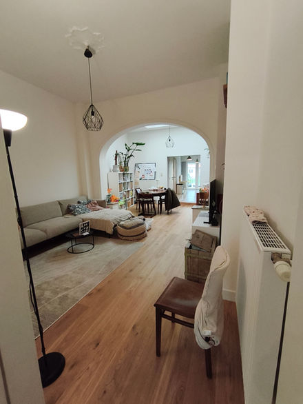 In de living met aansluitend eetruimte valt veel licht binnen door de lichtkoepel met sierglazen achter de authentieke boog. Er is nieuwe parket gelegd in 2025. Onder de zitruimte bevindt zich een droge kelder. Volgen verder recent vernieuwde ruimtes: keuken (2020), gastentoilet (2024), ruime wasruimte (2025) met trap naar boven die leidt tot een gerenoveerde zolderruimte (2026, slpk 1 - 20 m²).