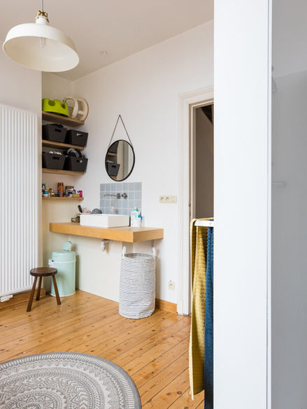 Je komt binnen in de hal met vooraan een ruimte die nu is ingericht als bureau (12 m²), en eveneens als praktijkruimte kan worden gebruikt omwille van een aparte toegang naar de leefruimte via de hal. Deze ruimte kan ook dienen om een buggy, dure fiets,... binnen te parkeren.